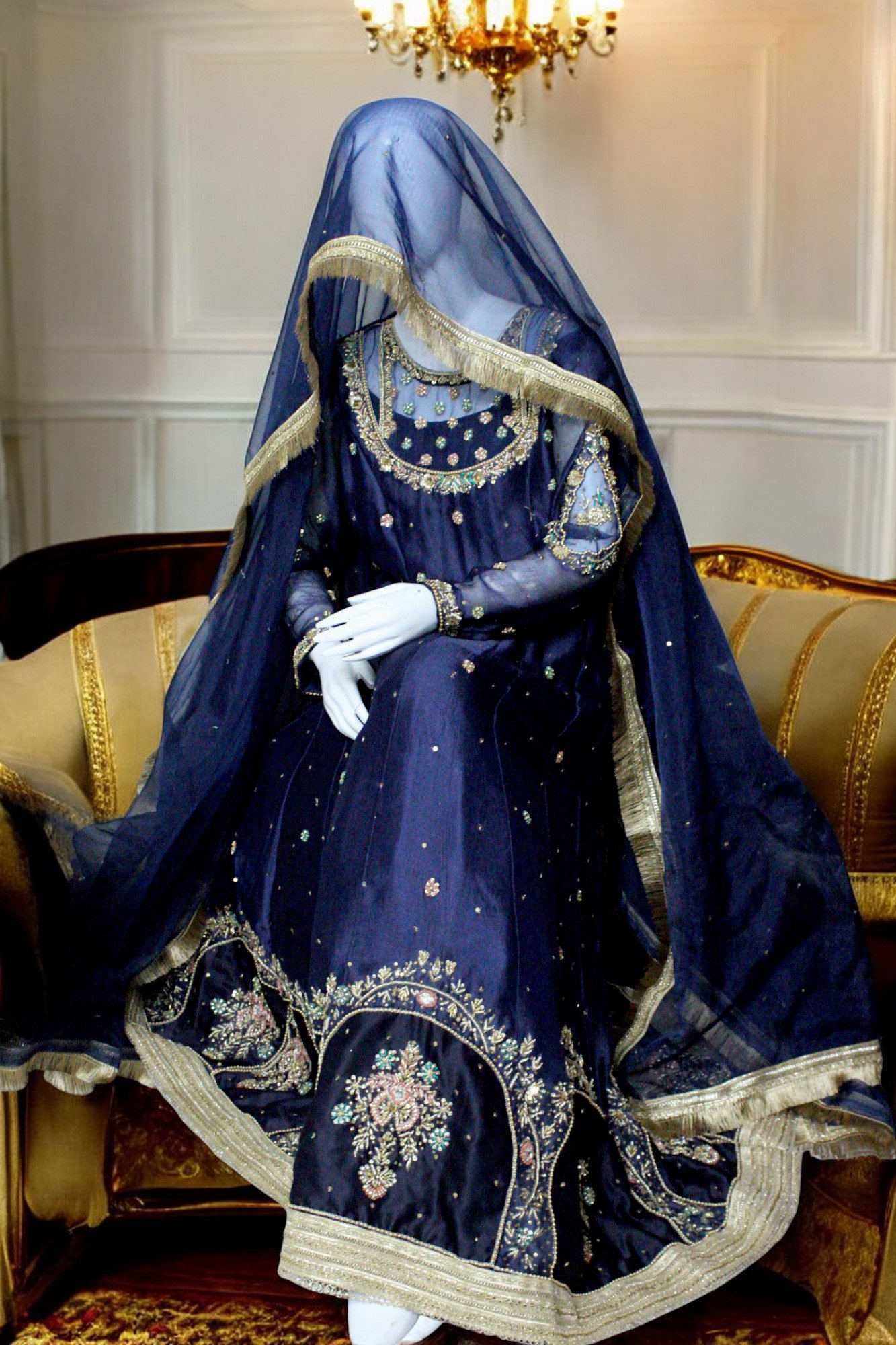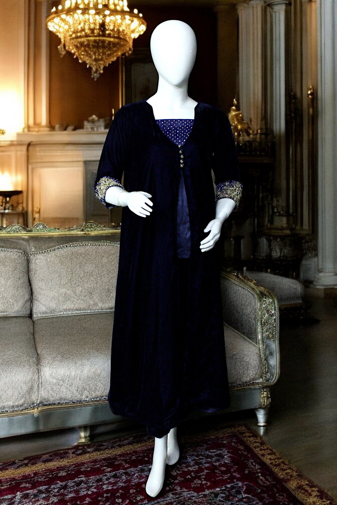 Navy Blue hand Embroidered Velvet Gown